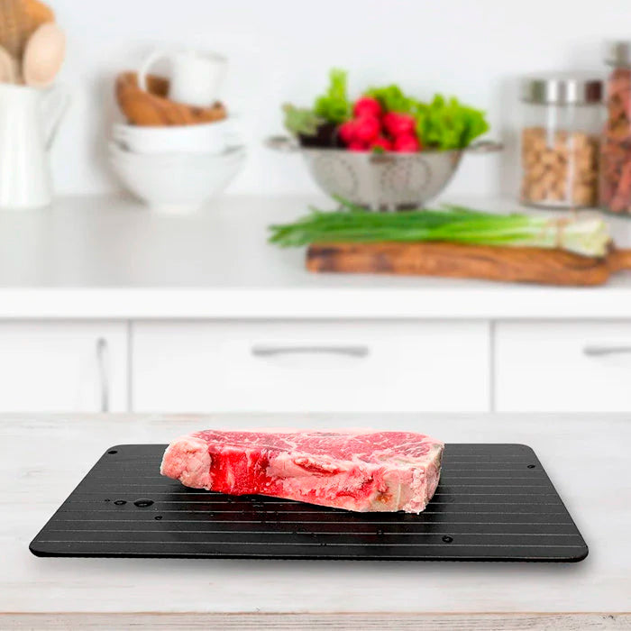 Feita em alumínio com revestimento antiaderente, é perfeita para descongelar carnes, peixes, aves e vegetais, sem necessidade de eletricidade ou produtos químicos.